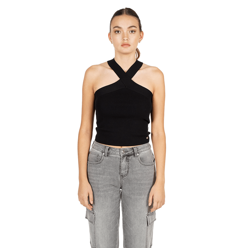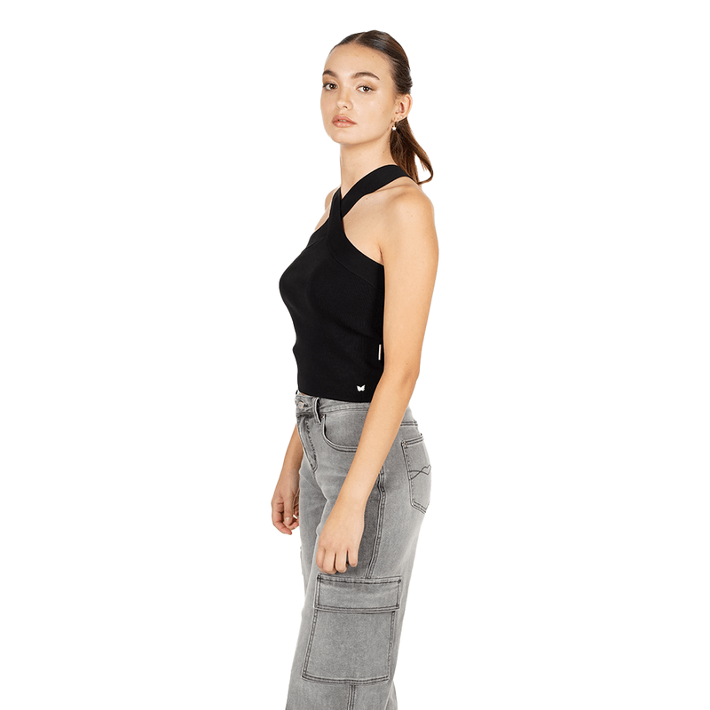 Nuestra modelo usa talla S. Detalle cruzado en el cuello para un toque chic. Tejido elástico, suavecito y favorecedor. Minimal con twist: simple, pulida y muy combinable.