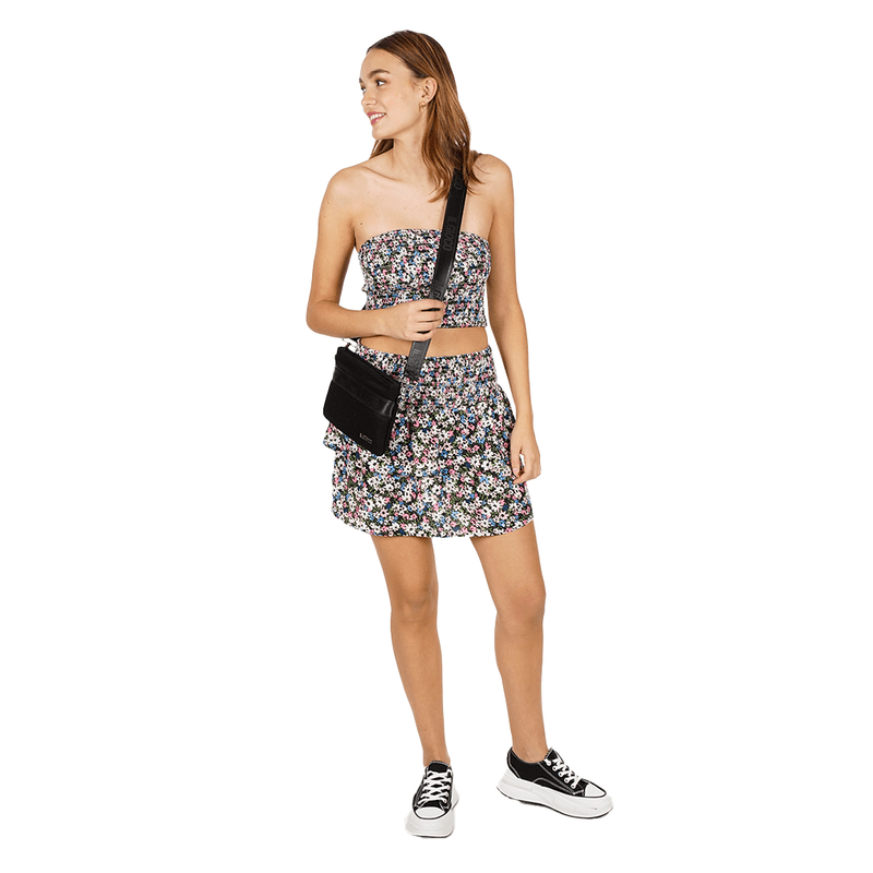 Nuestra Il Gioco Girl ocupa una talla S. Con un diseño cómodo y femenino, esta falda-short full print floral con efecto panal (smocked) en negro es texturada, elástica y ultra comfy. Femenina, juguetona y fácil de combinar, está confeccionada en 100% viscosa, pensada para moverte con libertad y brillar sin esfuerzo.